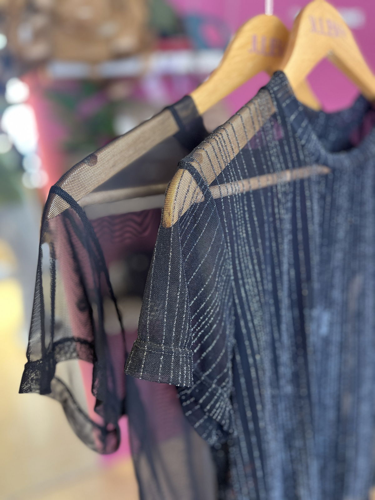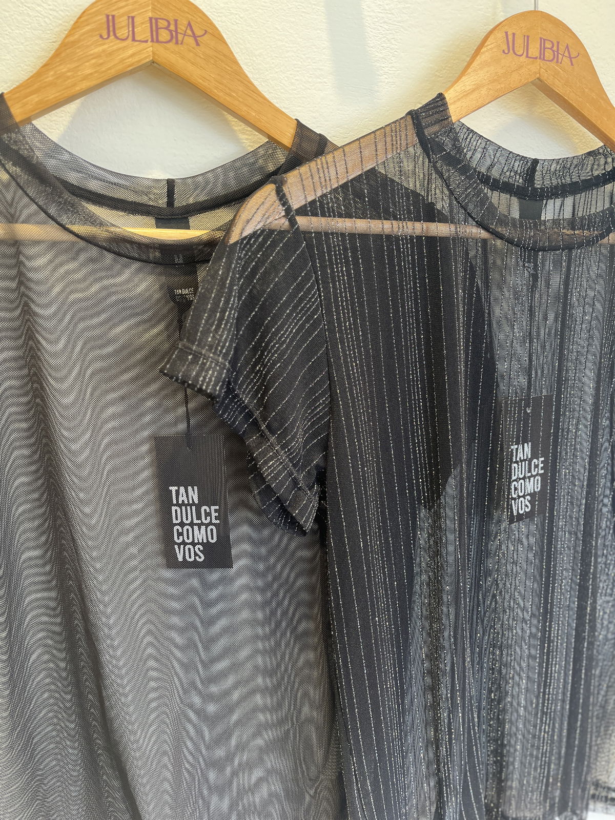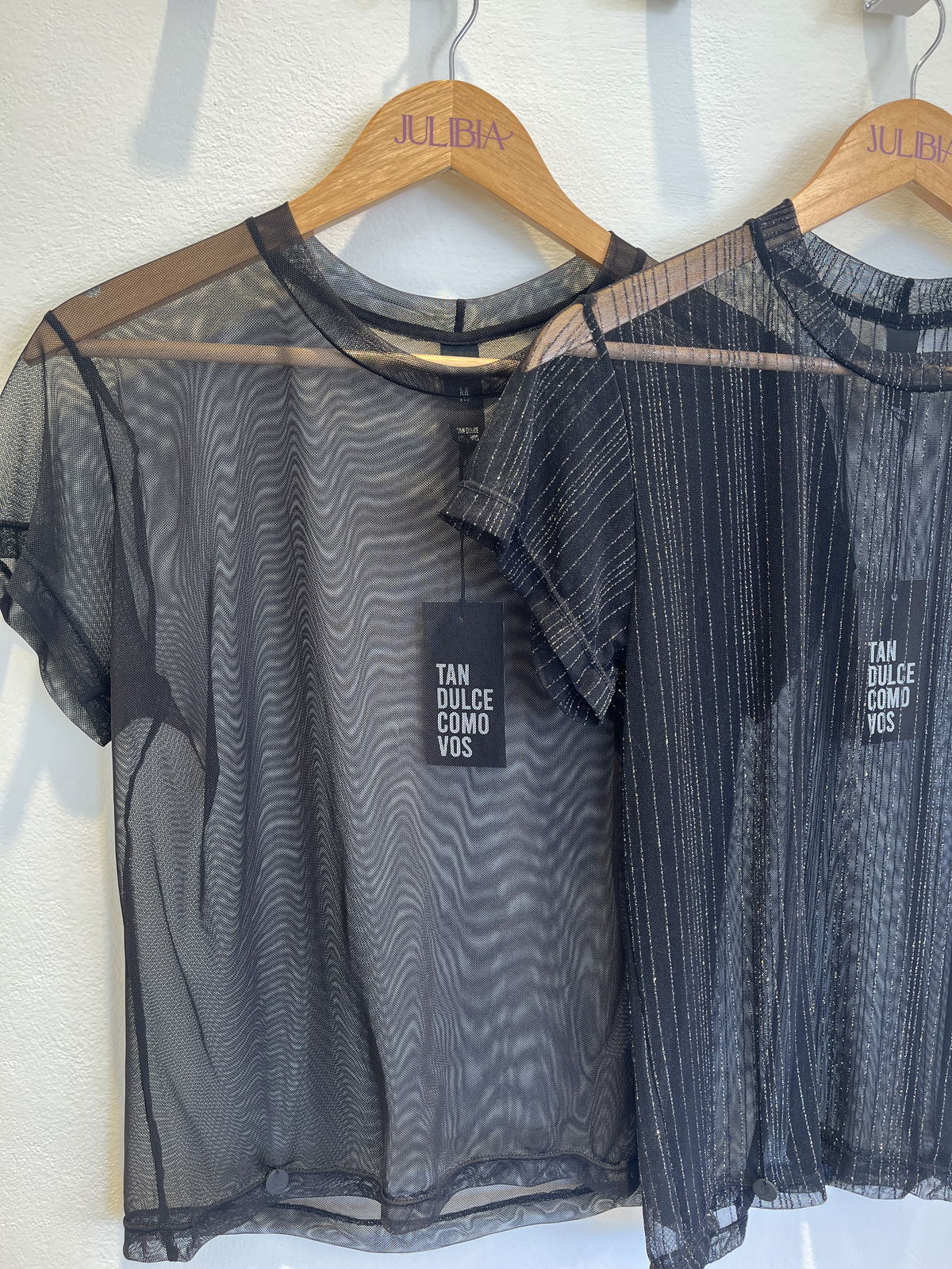 Remera mangas cortas, translucida , con brillos y sin brillos.